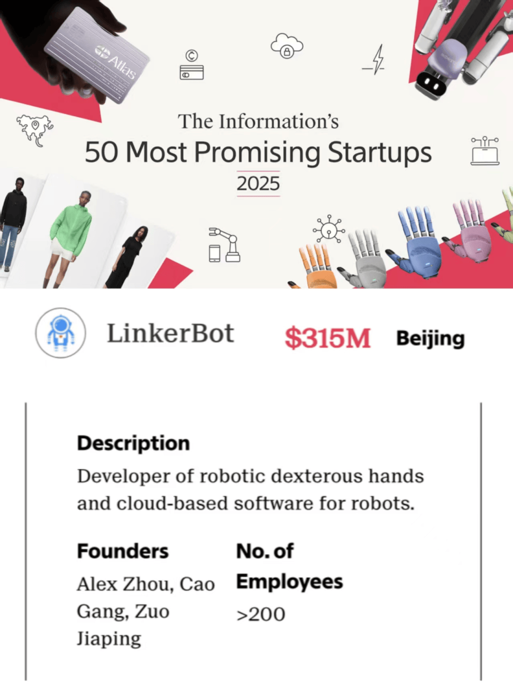 灵心巧手的兴起,是中国具身智能财产兴旺成长的缩影。正在具身智能这一融合了机械人学、人工智能、计较机视觉和材料科学的前沿范畴,中国企业正以史无前例的速度逃逐并超越。从国外的动力(Boston Dynamics)、特斯拉(Tesla)等企业,到国内的大疆立异(DJI)、优必选科技(UBTech)、宇树科技(Unitree)、灵心巧手(LinkerBot),中国企业已正在具身智能的分歧细分赛道上展示出强大的立异力和合作力。做为一家员工规模超200人的科技企业,灵心巧手一直以“工致手+云端智脑”为焦点计谋,打制了“工致手(微型减速器和施行器)—具身数据采集系统—工致操做模子”的全栈自研系统。此次入选《The Information》榜单,是灵心巧手的“里程碑”,更是中国机械人财产的“新起点”,工致手做为人形机械人的“焦点施行器官”,灵心巧手的冲破为中国机械人财产建立了环节合作力。我们,凭仗手艺立异取本土化劣势,中国智制终将正在全球工业智能范畴占领焦点。灵心巧手()科技无限公司成立于2023年7月,专注于具身智能结尾施行器及相关手艺和设备研发,建立了以Linker Hand系列工致手为焦点的完整生态。目前产物已正在斯坦福大学、剑桥大学、大学、大学、浙江大学等国表里顶尖高校尝试室,人形机械人本体厂商,美的、富士康等工场制制业落地利用,全球市场拥有率超80%,月销量冲破千台,是国内复杂具身智能范畴首个实现规模化落地的立异企业。2025年从4月到10月,7个月内完成种子轮、轮、A轮3轮融资。灵心巧手将加快量产能力升级、全场景手艺研发取全球化结构,进一步巩固其正在具身智能结尾施行器(工致手)范畴和工致操做数据及模子的龙头地位。