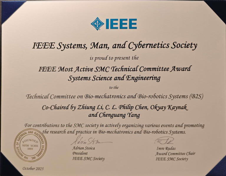 做为IEEE SMC Technical Committee on Bio-mechatronics and Bio-robotics Systems,李智军传授率领朝气电取仿朝气器人系统手艺委员会克意朝上进步,凭仗其正在手艺立异、学术勾当组织、跨学科合做及学术社区扶植等方面的杰出表示,从70多个手艺委员会中脱颖而出,荣获该奖项。